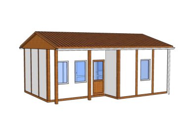 Die Wände bestehen aus vorgefertigten Elementen, in die Fenster und Türen bereits montiert sind.